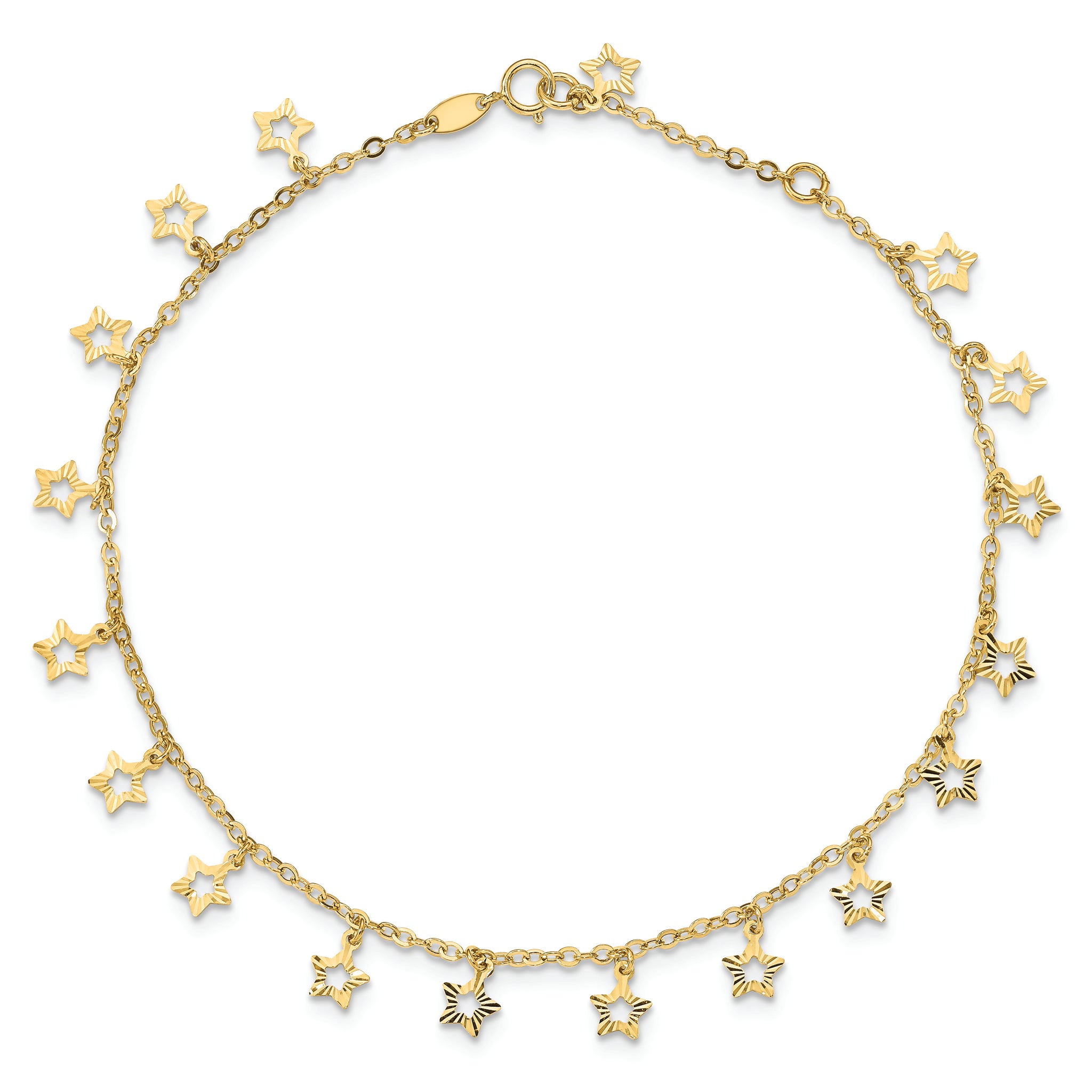 14k Polished and Textured Star 9in Plus 1in ext. Anklet