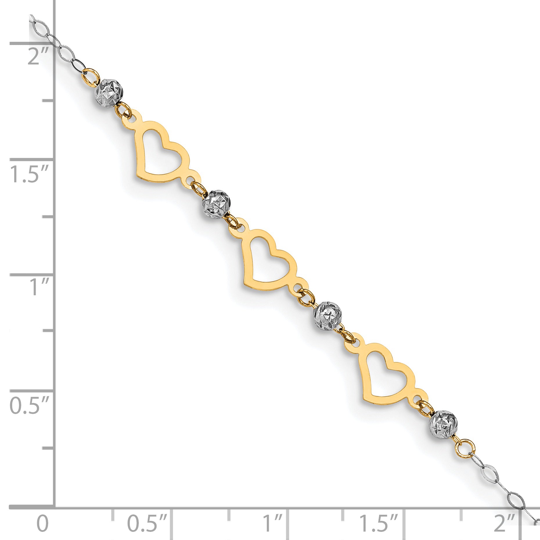 14K Two-tone Oval Link Diamond-cut Beads and Heart 9in Plus 1in Ext Anklet