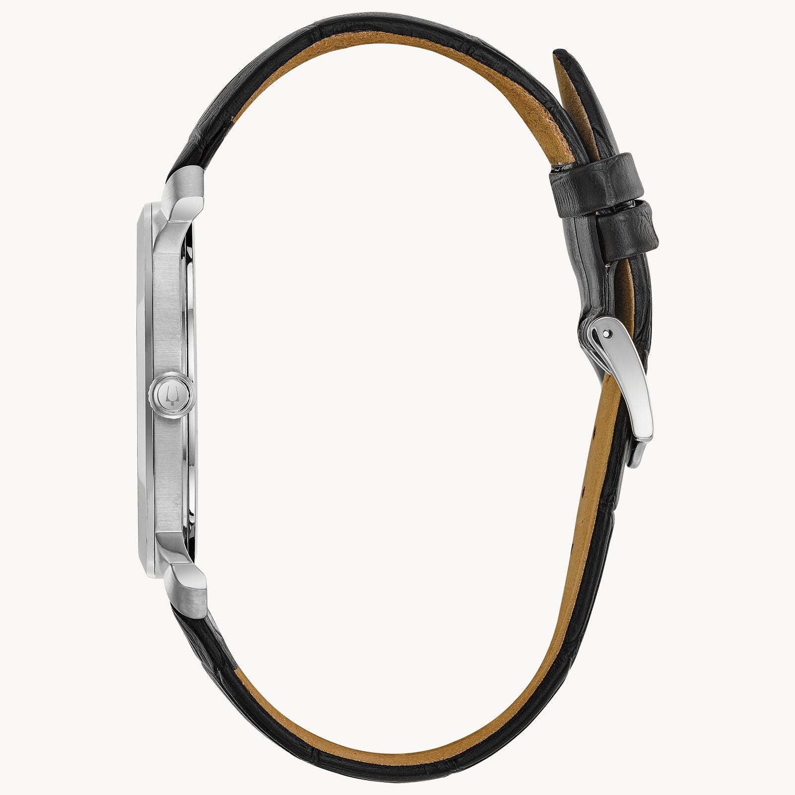From the Classic Collection. In stainless steel with silver-white sunray dial, second hand, and black leather strap.