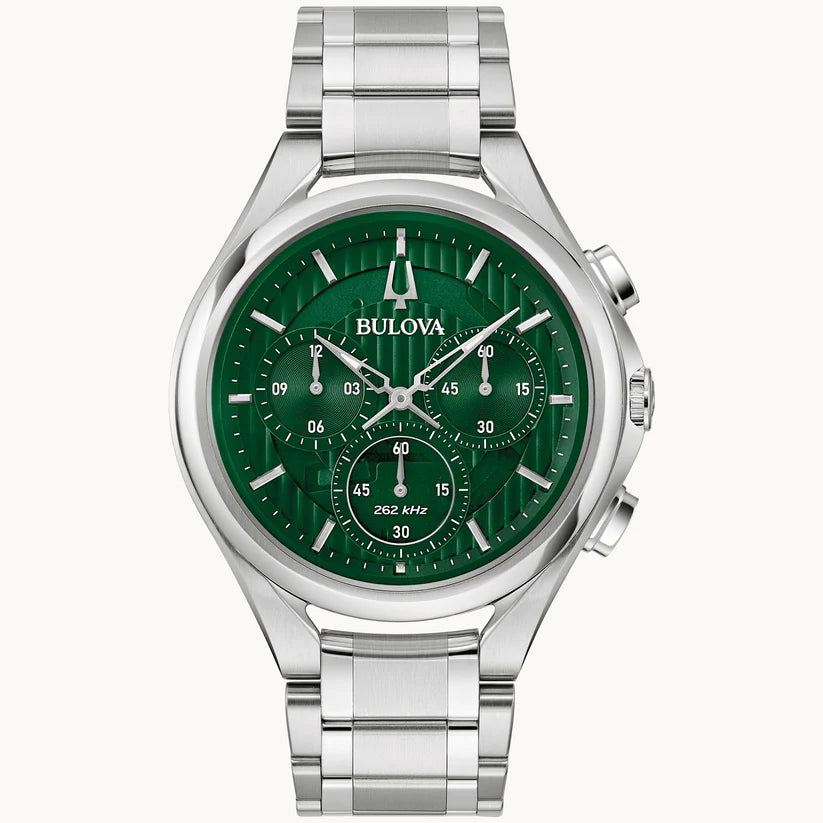 This new Bulova men’s five-hand chronograph timepiece pushes the groundbreaking CURV collection in a new direction that affords unrivaled sophistication together with Bulova’s cutting-edge technology. CURV timepieces are equipped with the world’s first curved chronograph movement, with high-precision 262khz quartz technology offering exceptional accuracy of 5 seconds per month. This new CURV model features a dynamic silver-tone stainless steel case with brushed and polished finishes and a curved sapphire crystal. The vibrant green dial features striped patterning, with a translucent ring allowing a peek at the intricate movement beneath. Silver-tone stainless steel markers and hands offer contrast against the dial, while three sub-dials display the elapsed chronograph time in 12-hour, 60-minute, and 60-second intervals. The chronograph 60-second sub dial at 6 o’clock doubles as the standard seconds hand. The dual mode is implemented by the 4 o’clock pusher. The watch is paired with a matching tapering silver-tone stainless steel bracelet with a deployant clasp with pushers. Reinterpreting the elegant lines of the original CURV, this new Bulova timepiece offers a polished aesthetic that pairs perfectly with an exquisite lifestyle.