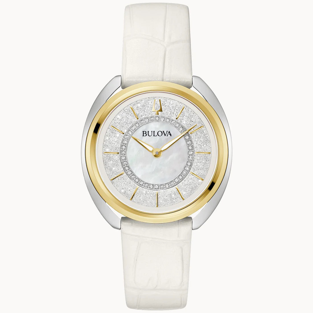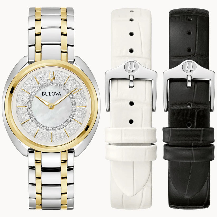 A stunning new addition from Bulova, this ladies’ Duality timepiece offers unparalleled sophistication and versatility. A round silver- and gold-tone stainless steel case features a luxurious blend of brushed and polished finishes, with dramatic curves and a hidden crown. The dial is truly astonishing: a resplendent silver white Denchu, and the mother-of-pearl surface is adorned with 40 hand-set diamonds totaling .10 ctw and fitted with polished hands and indices. The intricate process of making each Denchu dial ensures that no two are alike, allowing a truly unique experience. The Duality is perfectly appointed with a matching silver and gold-tone stainless steel bracelet with a deployant clasp for exceptional comfort. Included in this unique box set are two leather straps, in black and white, that can be attached with the use of a new easy release system that is also featured on the bracelet. With an elegant silhouette and a gorgeous dial, this Bulova women’s timepiece offers timeless refinement no matter the occasion.