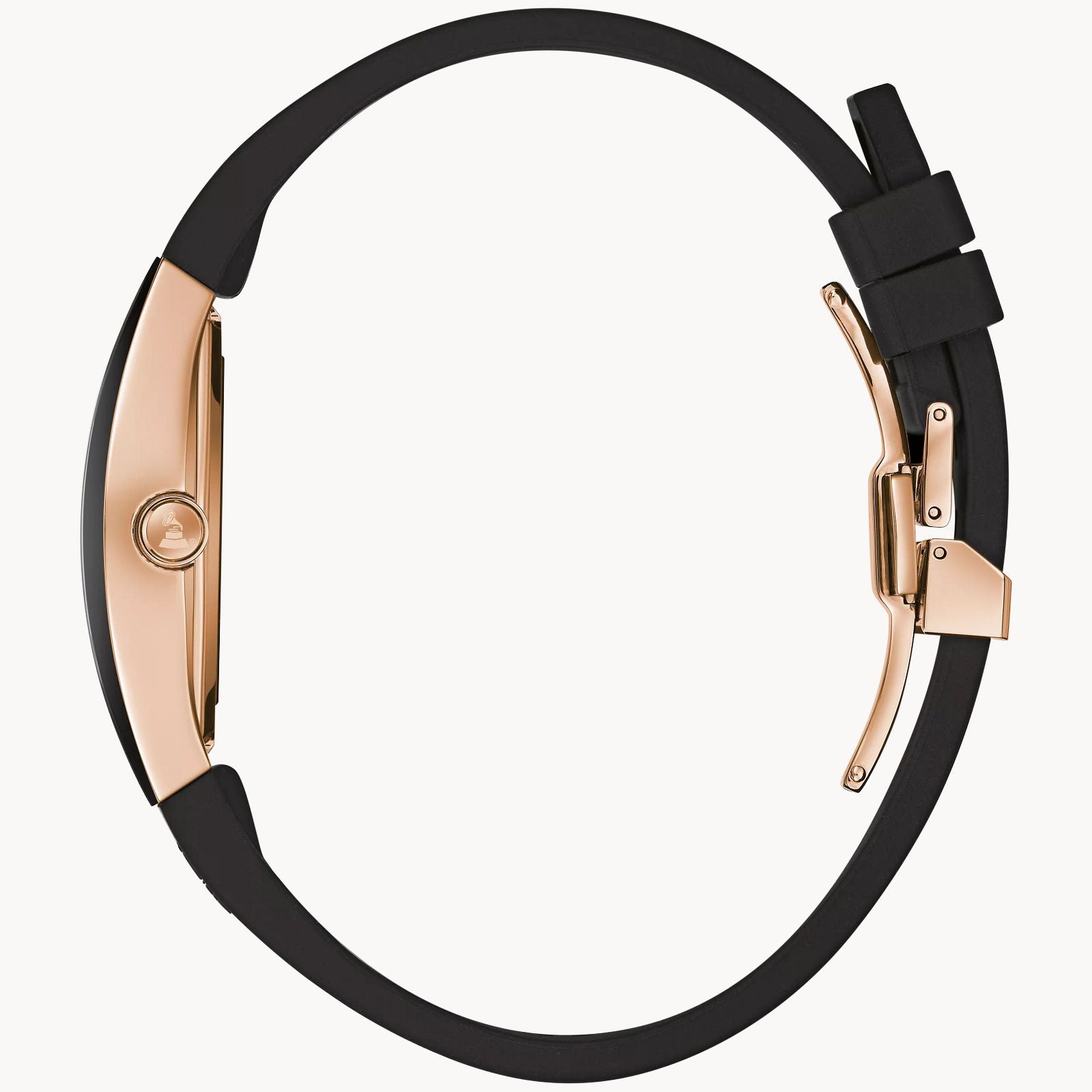 As the official Timepiece partner of The Latin GRAMMYs®, Bulova has created the Latin GRAMMY® Gemini, a new curved tonneau design. The distinctive asymmetrical rose gold-tone stainless steel case with a black signature Futuro edge to edge curved metalized crystal features a black dial with rose gold-tone accents. The black silicone strap features the iconic Latin GRAMMY® logo on the front, as well as on the case back which showcases the platinum colored logo to commemorate the 21st Annual Latin GRAMMY® Awards. The watch features a three-hand quartz movement, deployant buckle with pushers, and water resistance to 30 meters.