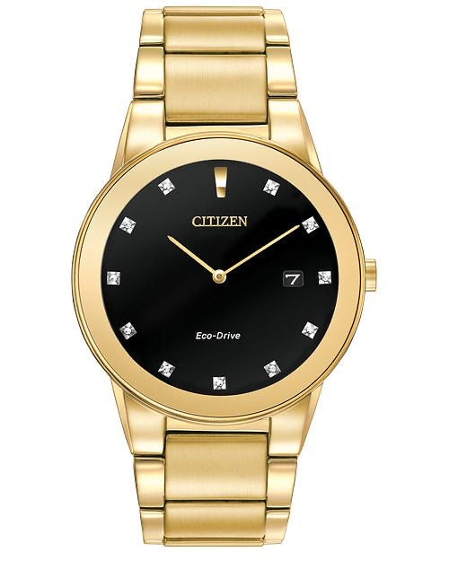 Axiom's refined yet sleek design offers a day-to-night fashion option for the avid trendsetter. This timepiece, with gold-tone stainless steel case and bracelet with black dial, features the intriguing detail of edge-to-edge glass, an 11 diamond dial and date. Featuring our Eco-Drive technology – powered by light, any light. Never needs a battery. Caliber number J165.