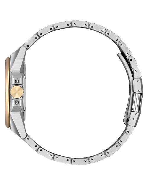 Balancing the worlds of robust wear and refined styling, the 831 features a 40mm two-tone, faceted stainless steel case with silver and rose gold-tone details paired alongside the best of Citizen's finishing techniques. With its matching stainless steel bracelet, the watch is ready for wear in any instance. Underneath a sapphire crystal, a textured champagne dial with more rose gold-tone details is as captivating as it is practical, playing in the light while being highly legible an account of its applied indices and the sharp design of hands. A 3 o'clock date window adds even more utility to the design, while the automatic mechanism which powers it secures the timepiece against strong magnetic fields. Water resistant up to 100 meters. Caliber 9051.