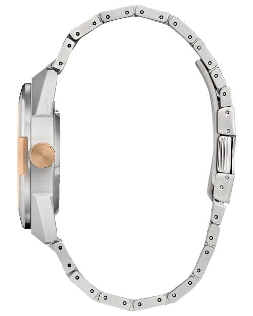 A silver-tone stainless steel case just under 41mm enables comfortable wear with its integrated construction and two-tone bezel highlighting Citizen's expert finishing abilities. A handsome tapered bracelet secures the watch to the wrist, its design following the aesthetic of the case in its use of polished and brushed facets. Beneath a sapphire crystal, the watch's textured gray dial features rose gold-tone applied indices and lume-filled hands, each working together to offer incredible legibility alongside a utility-driven 3 o'clock date window. Water resistant up to 100 meters. Caliber 0950.